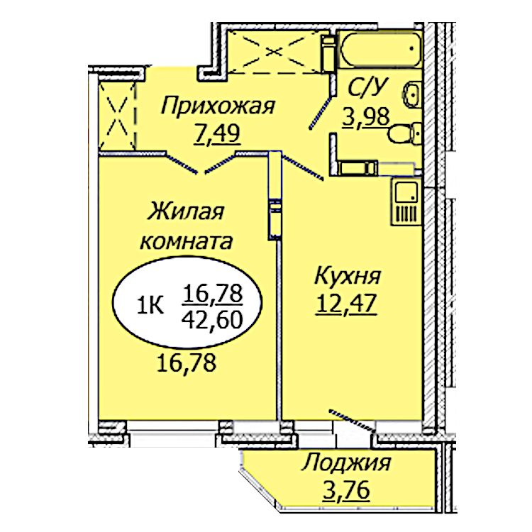 1-комнатная квартира 42.6 кв.м в ЖК Комета-Октябрьский
