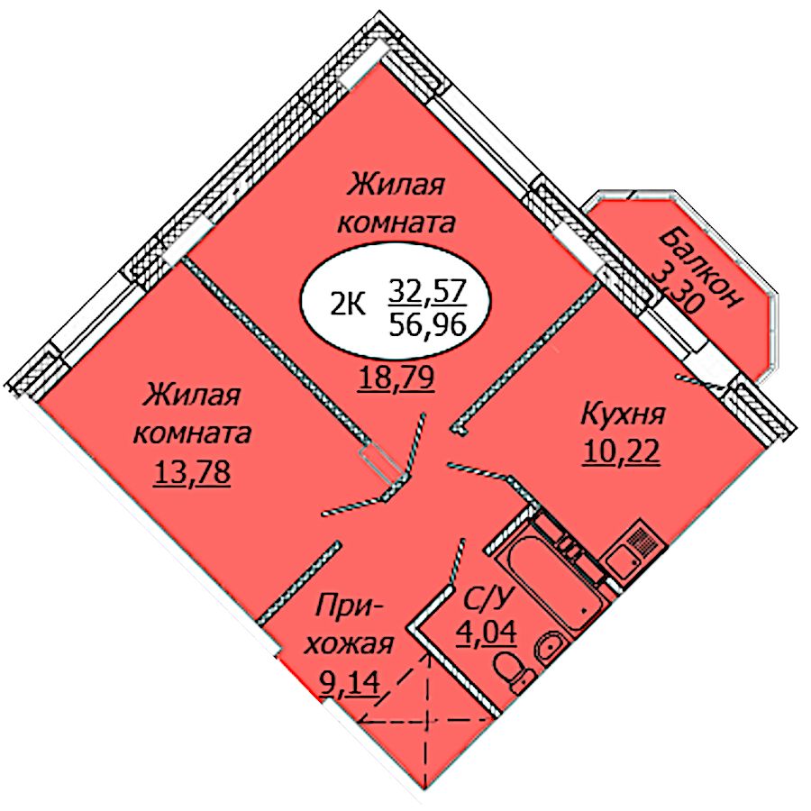 2-комнатная квартира 56.96 кв.м в ЖК Комета-Октябрьский