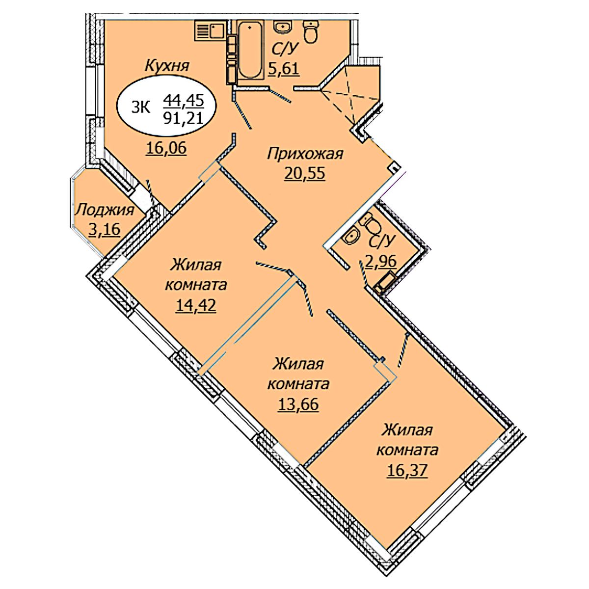 3-комнатная квартира 91.21 кв.м в ЖК Комета-Октябрьский